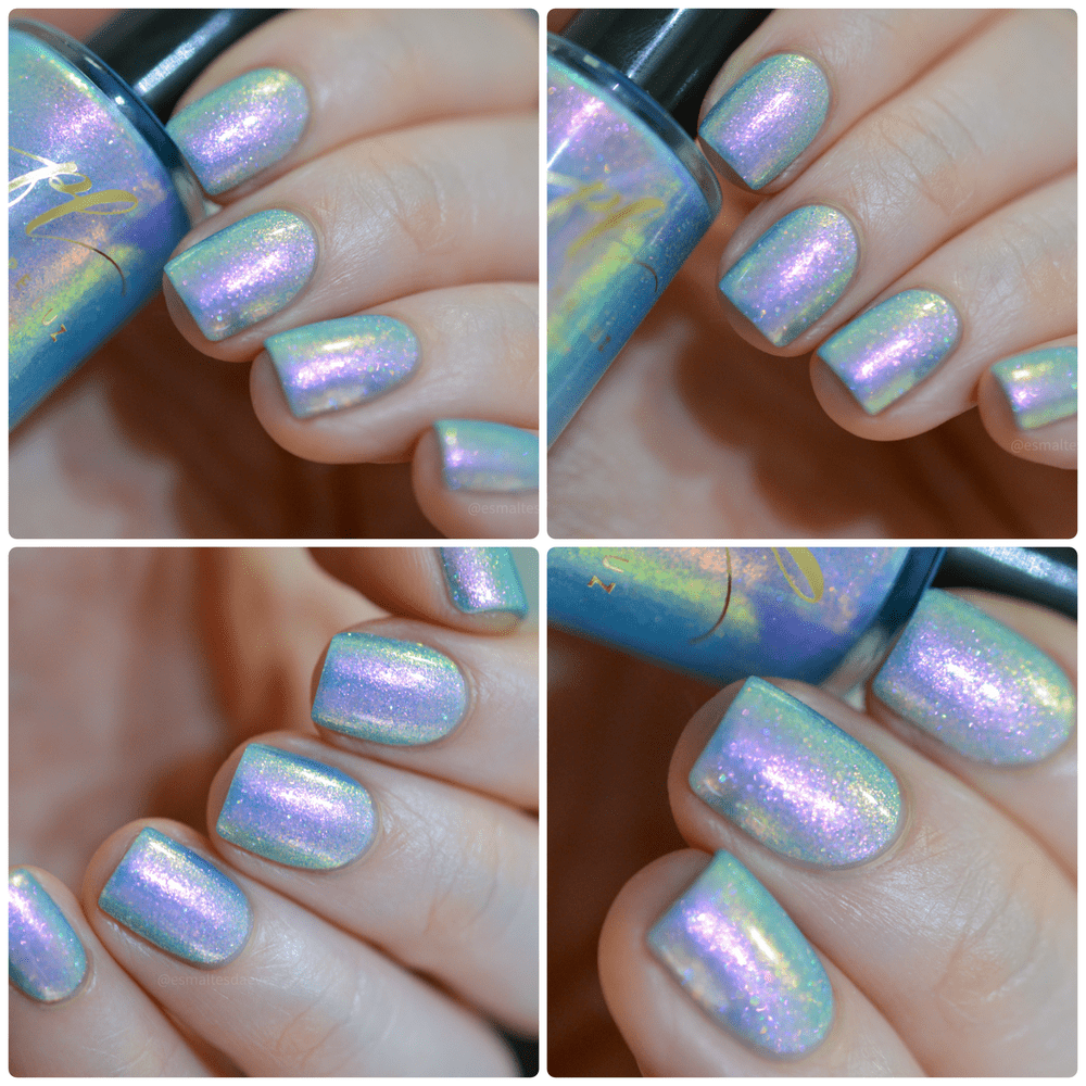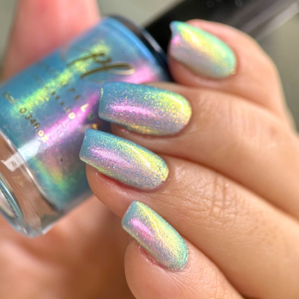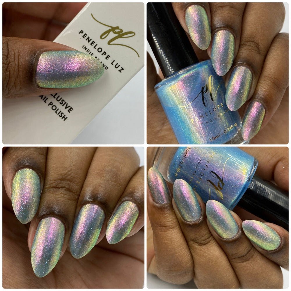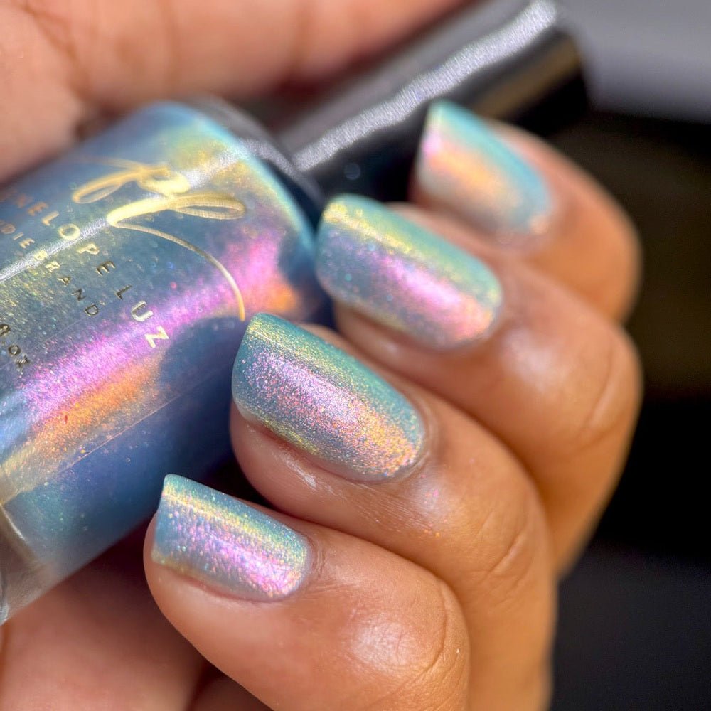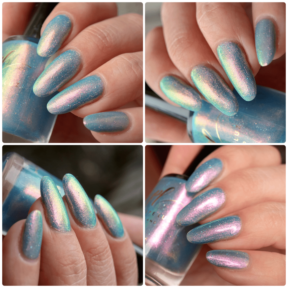 Inspired by the work "Windy Day, Claude Monet" by Ukrainian artist Oleg Shupliak, in homage to the great impressionist Claude Monet - The polish features pink/red/gold sparkle shimmer with a blue base and a touch of silver holo glitter.
