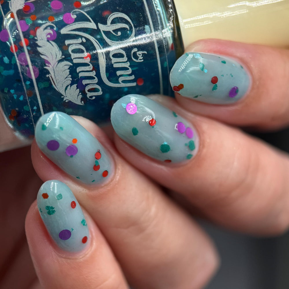Pond Effect is inspired by all those resin artworks that through the media, and layers and layes and painting create that depth effect that mesmerizes all. Pond Effect has a sheer blue base with a mix of white and green irregular glitters and magenta and hot orange dot glitter