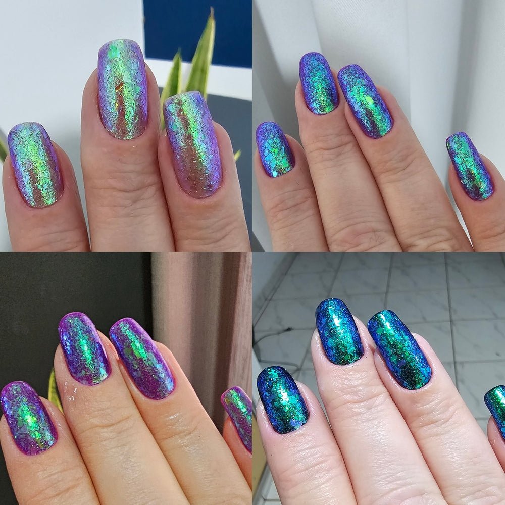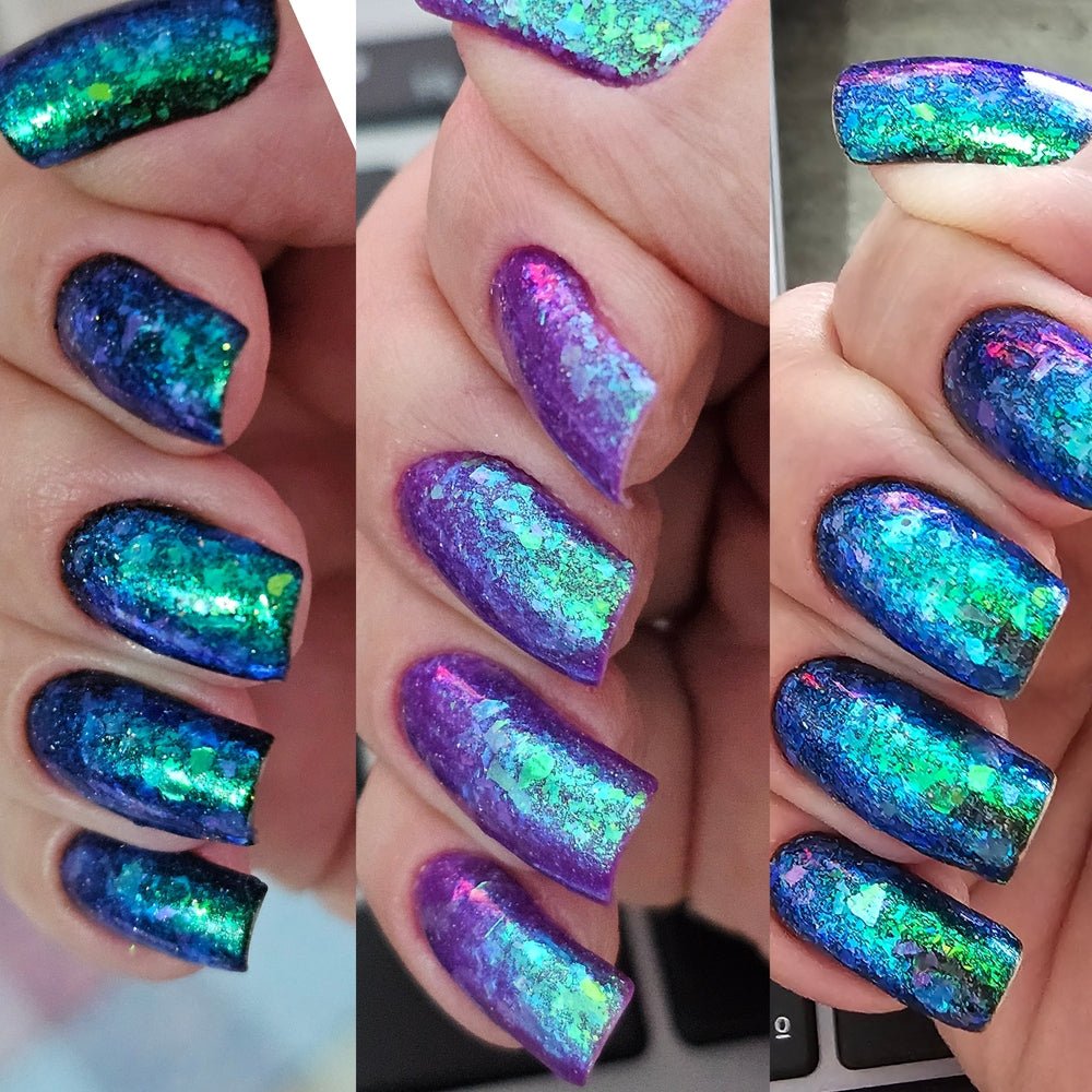 It has a grape jelly base, with turquoise/blue/violet aurora pigment, delicate iris-like flakes, and reflective glitter that makes it glow from every angle!
