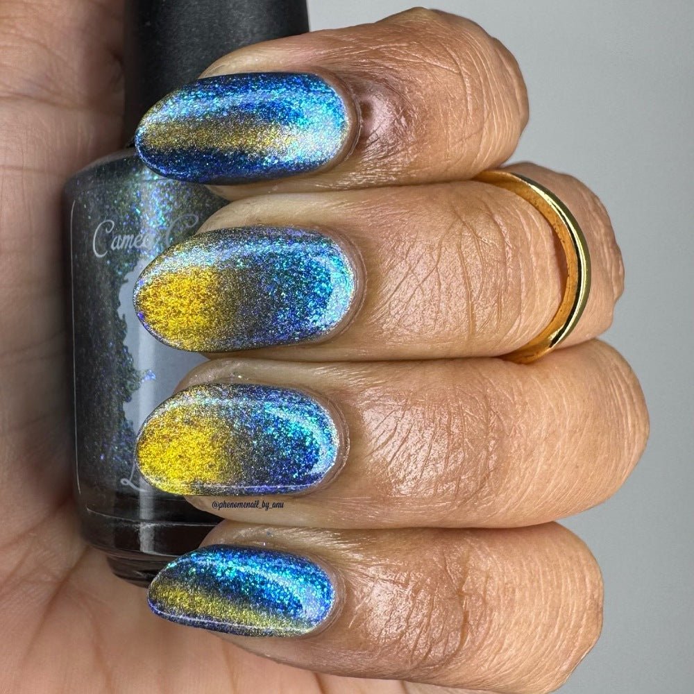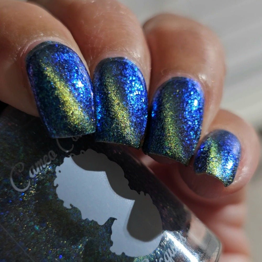 The Blue Ringed Octopus. | A blue tinted base, full of shifty blue flakes, with a gold magnetic pull.