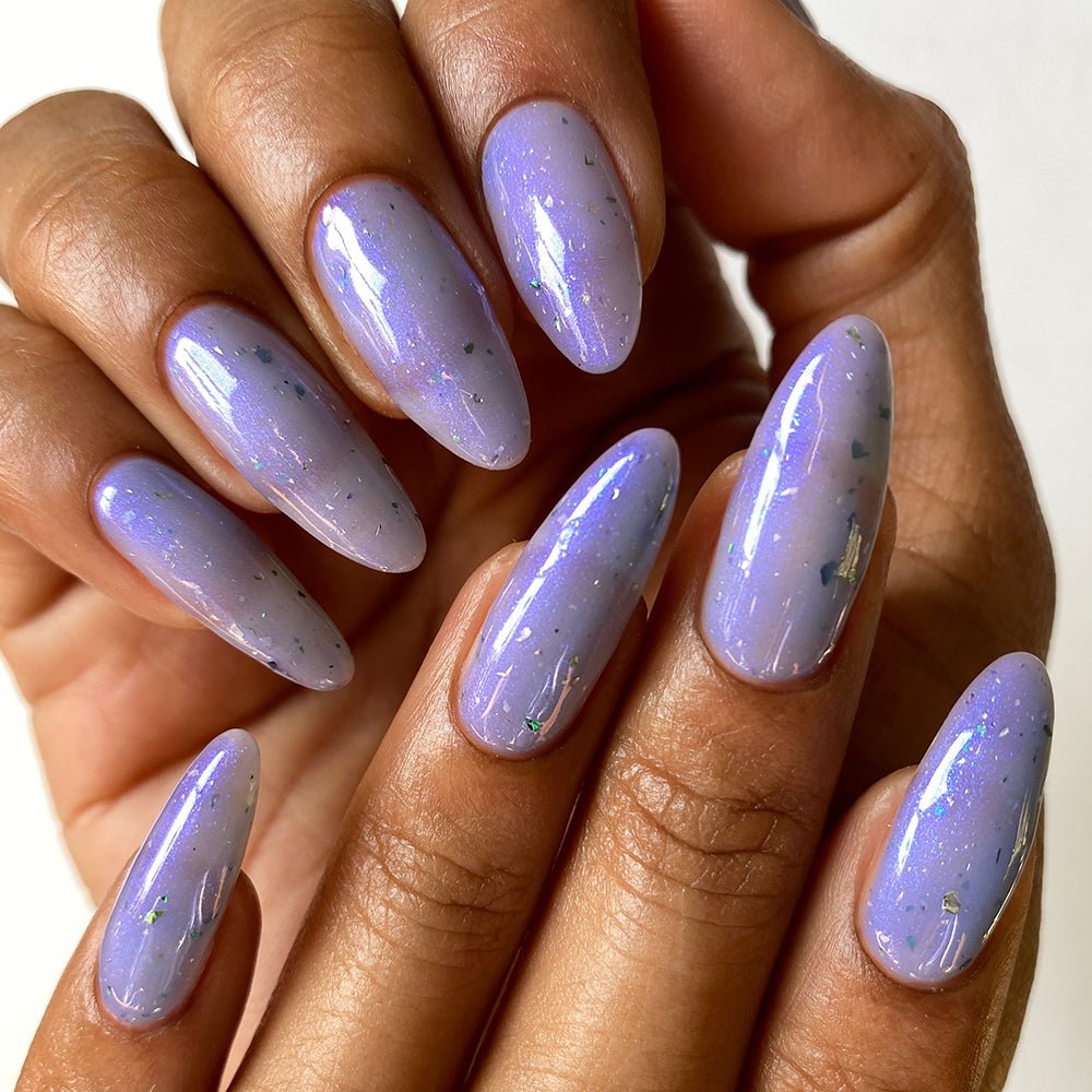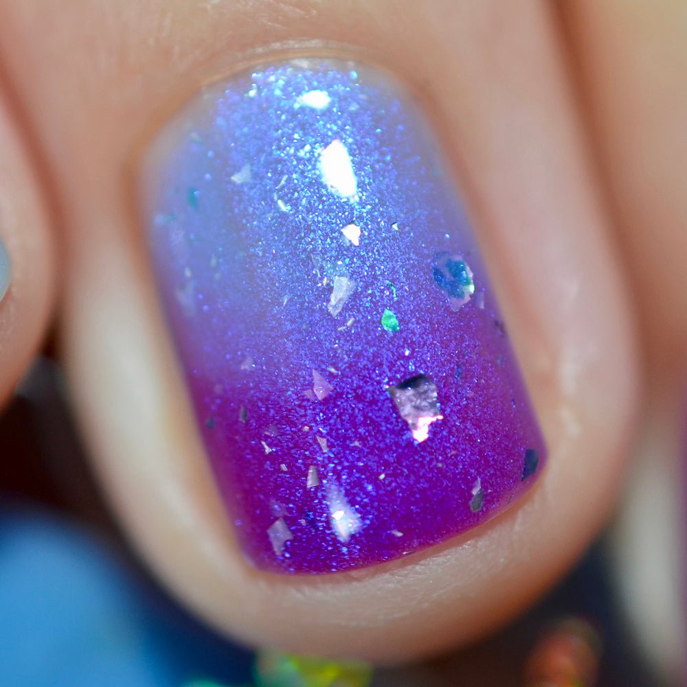 Change of Heart has a moody baby blue base with soft blue shimmer and pearly metallic flakes that brightens up to a berry base when exposed to UV.