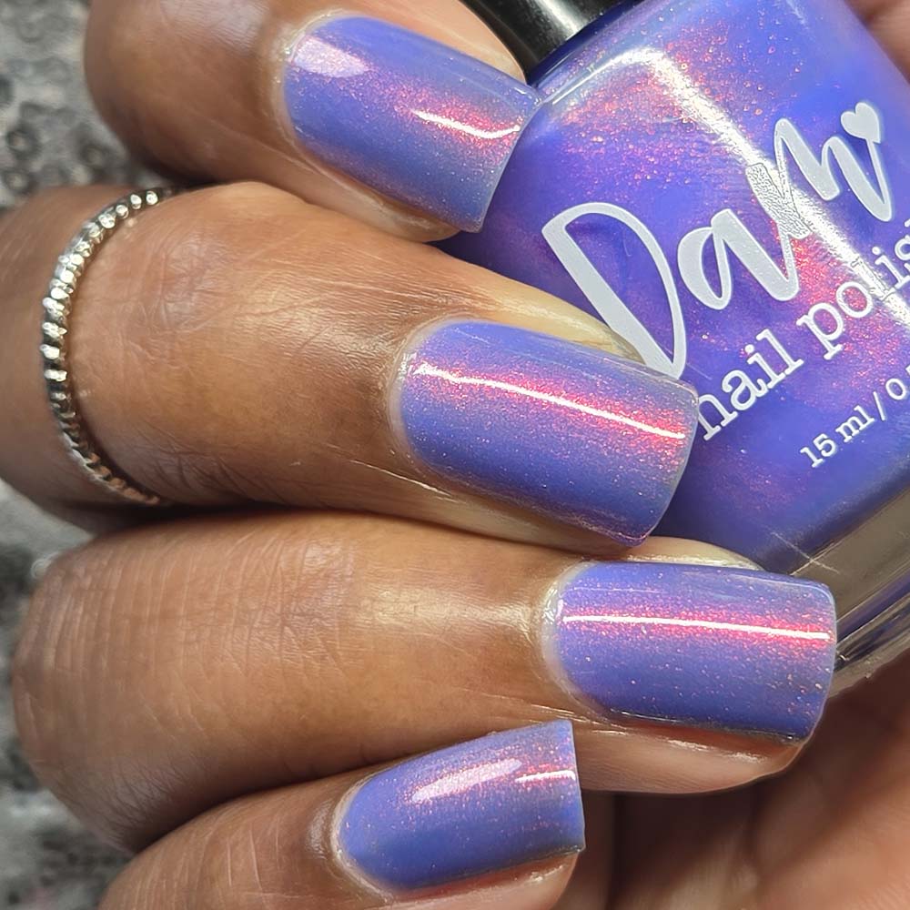 This one is a sheer periwinkle with red/orange shifting shimmer