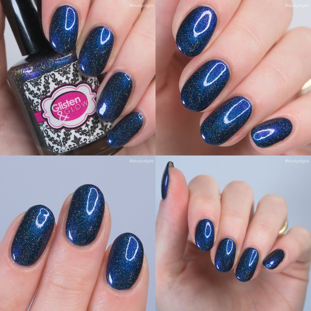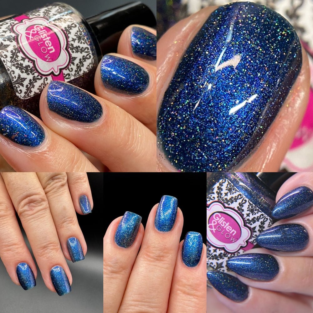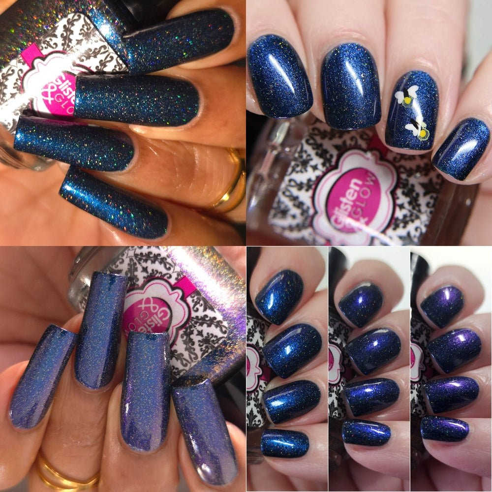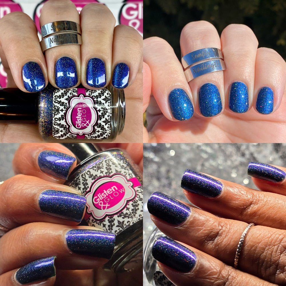 dark navy jelly polish loaded with blue/purple color shifting shimmer and dancing firefly gold holographic micro glitters