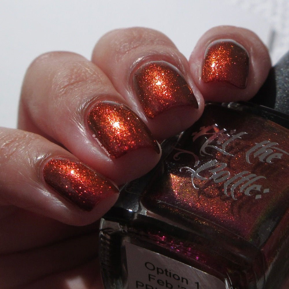 Inspired by the Amanita muscaria mushroom (fly agaric or fly amanita), with it's distinctive red cap and white spots. This is a pinkish crimson polish that shifts to a rusty orange with slight tones of olive at angles.