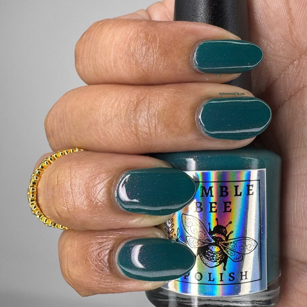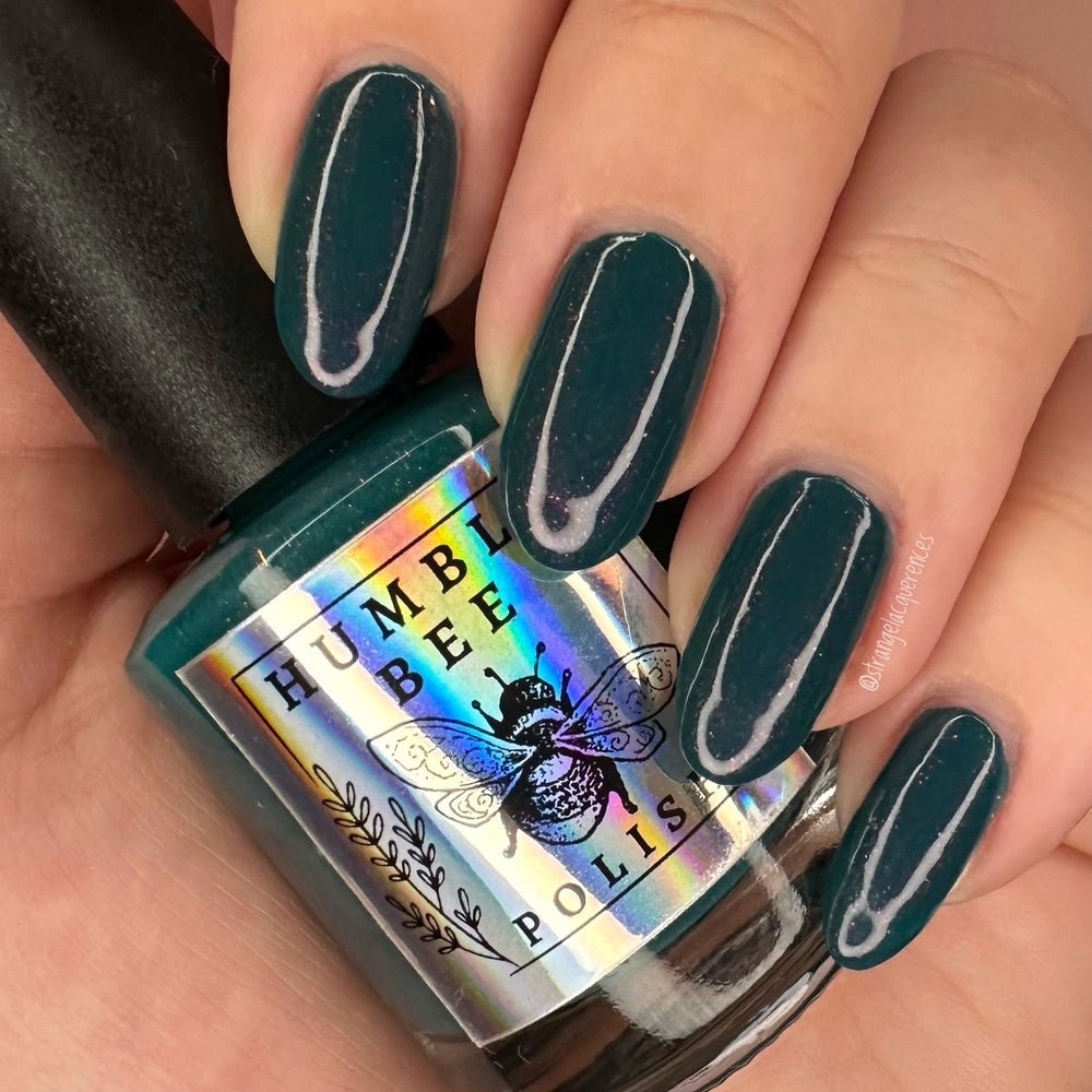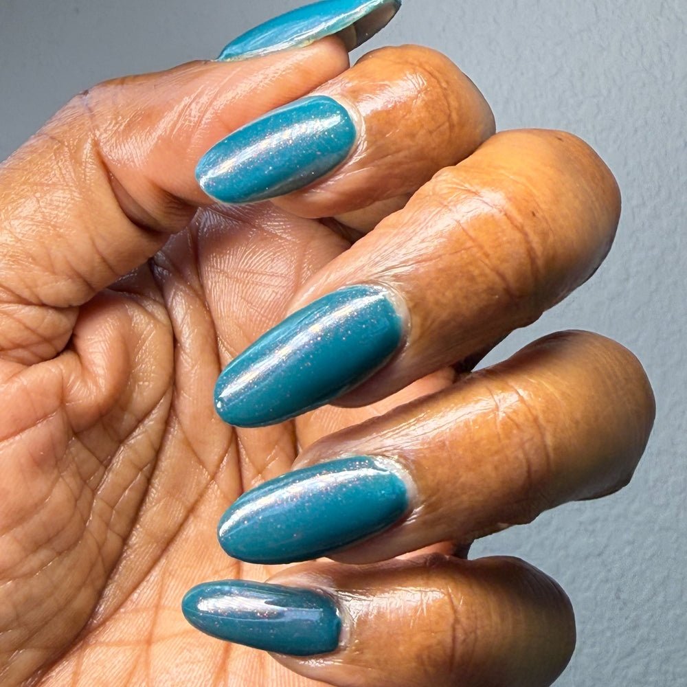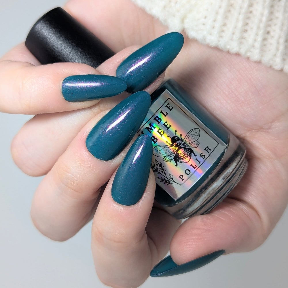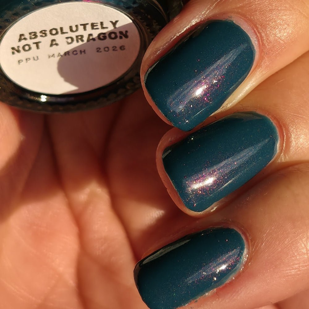 Inspired by dragonflies. Absolutely Not A Dragon is a turquoise base with magenta, pink, orange, gold, and lime green shifting aurora shimmer.