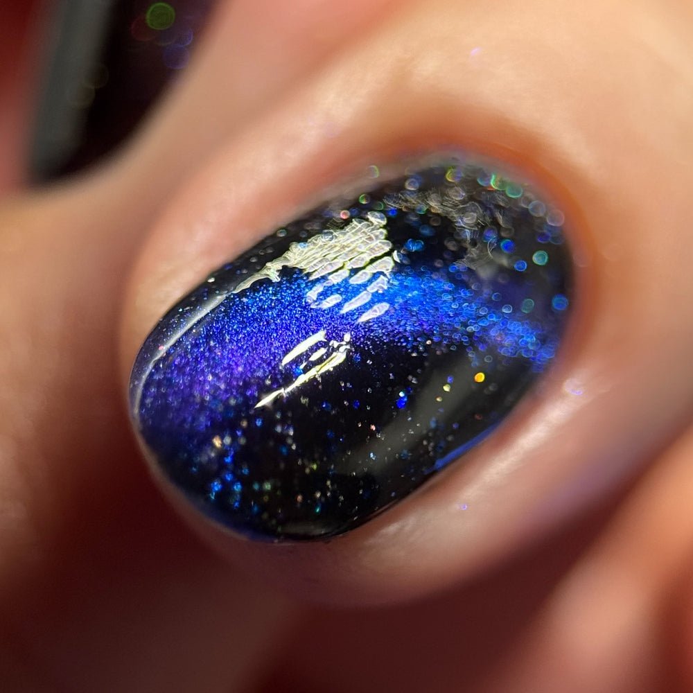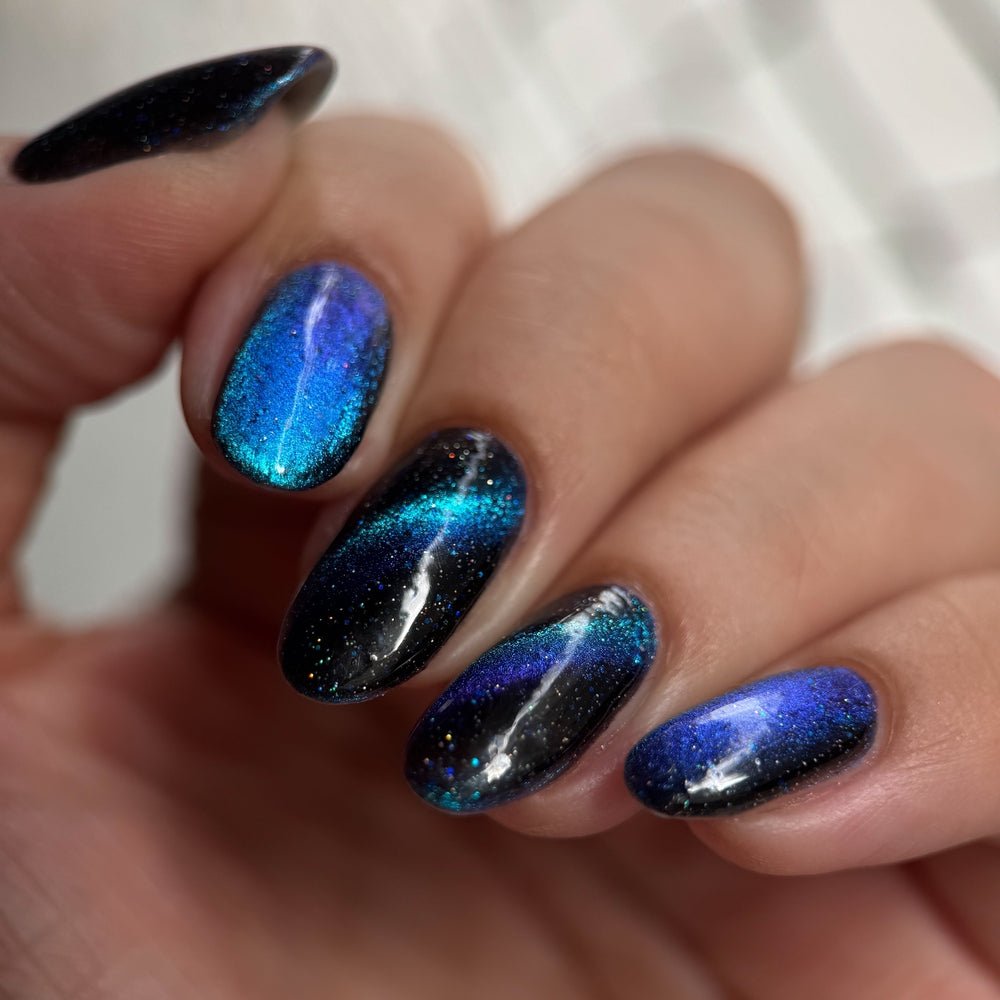 Blue/purple/pink multichrome magnetic with blue and silver micro glitters holo.