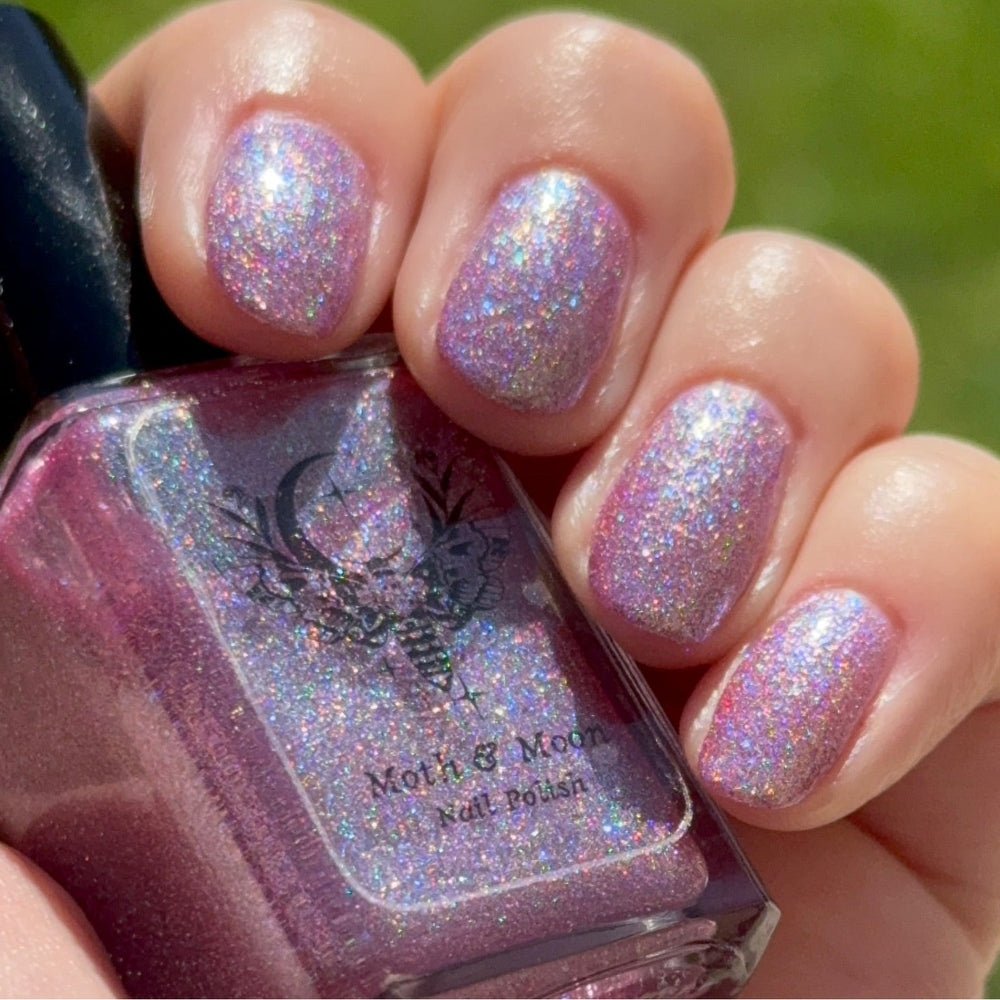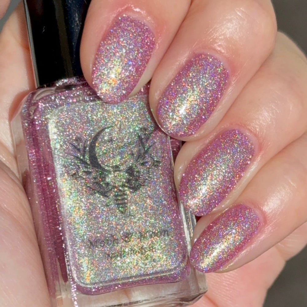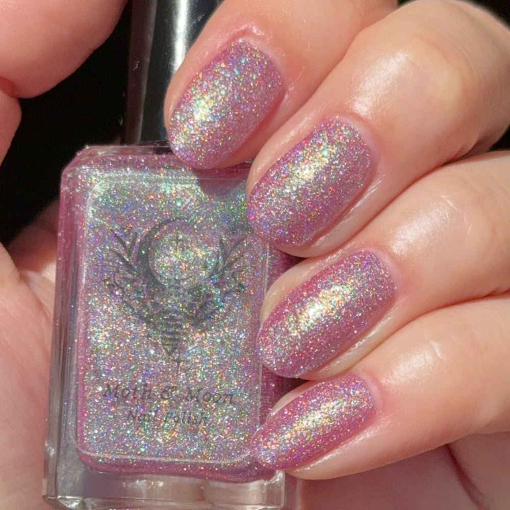 Inspired by @badwonton Froggo comics. Light pink with green and gold iridescent shimmers, holographic pigment, and silver reflective glitter.
