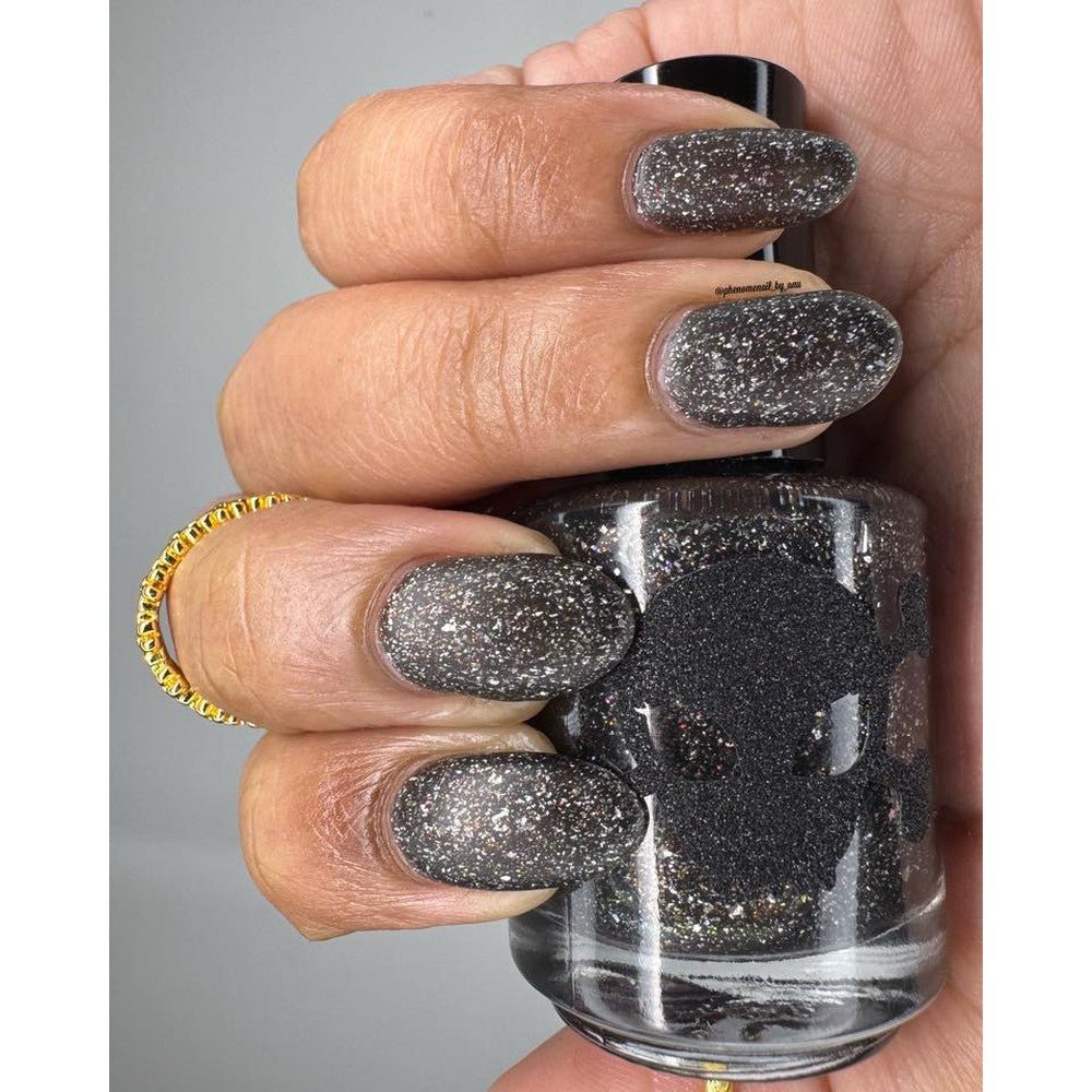 This jelly black polish is filled with holo flakes, scattered holo glitter, red-blue-purple aurora and silver flakes.