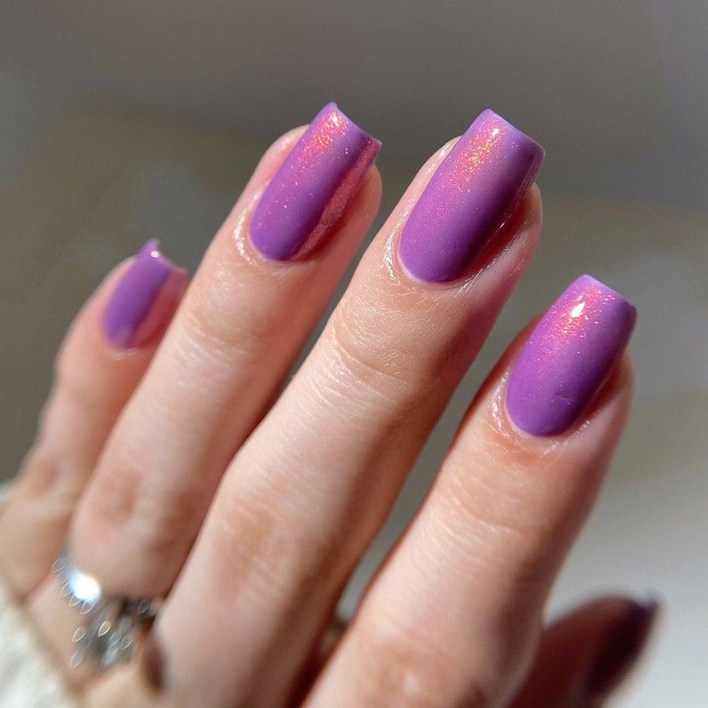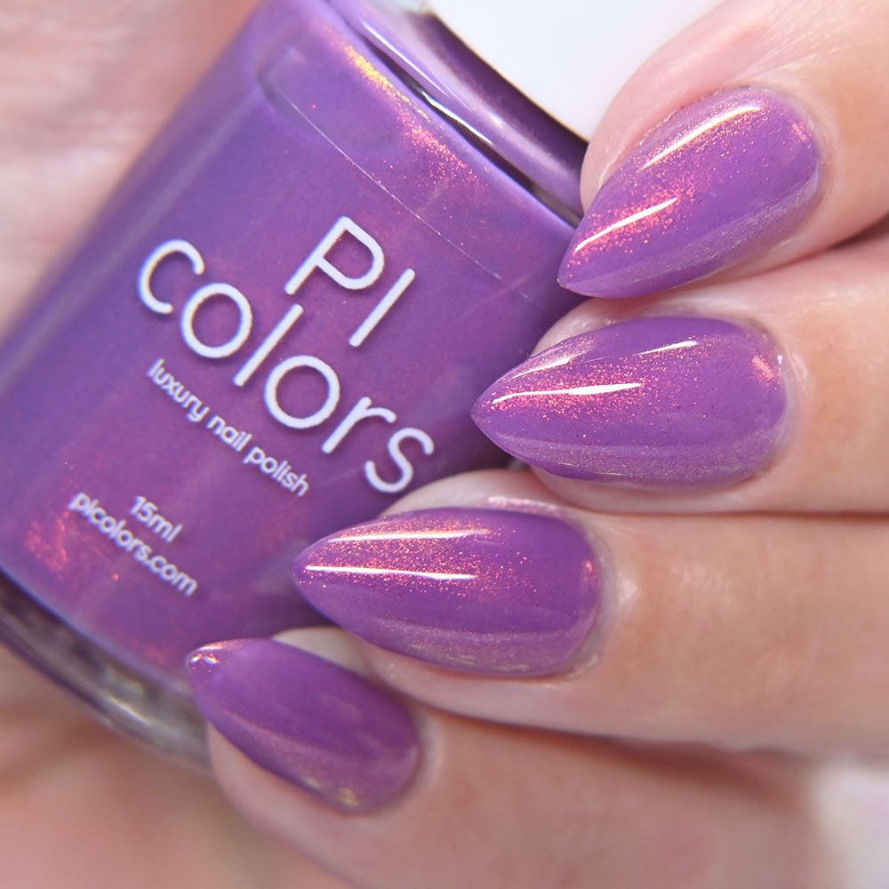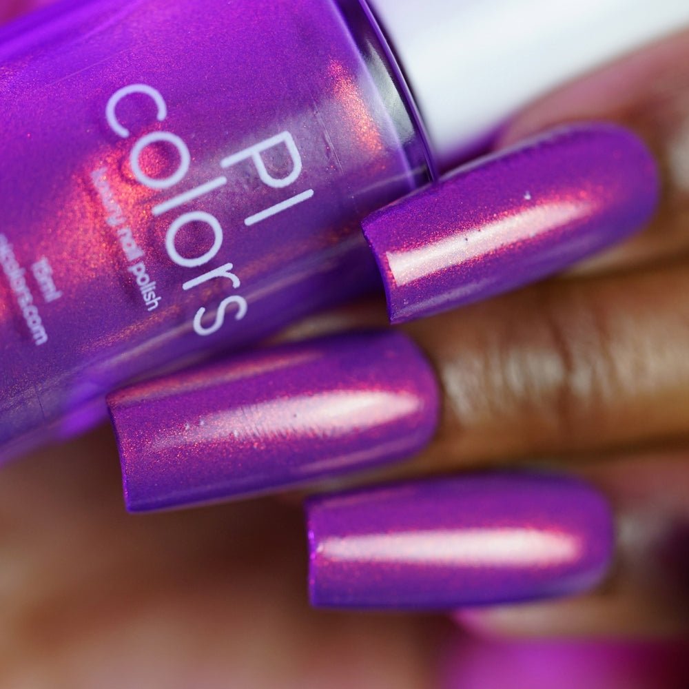 This polish is a deep reddish purple nail polish with strong red and orange gold shimmer. Inspired by Britney for the Y2K theme!