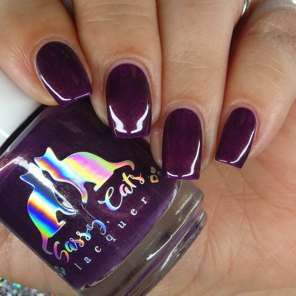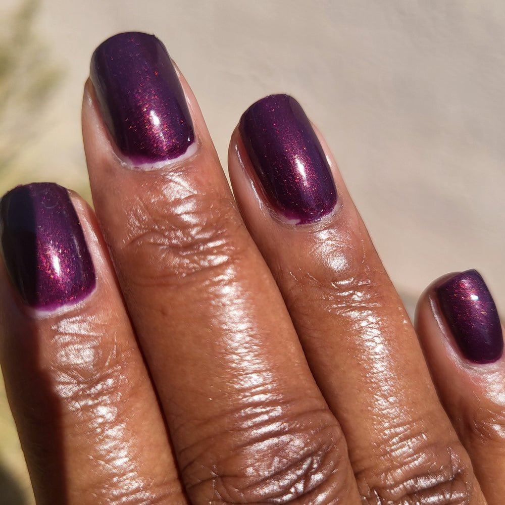 Eggplant purple base Copper shimmer and green yellowish glow in the dark effect