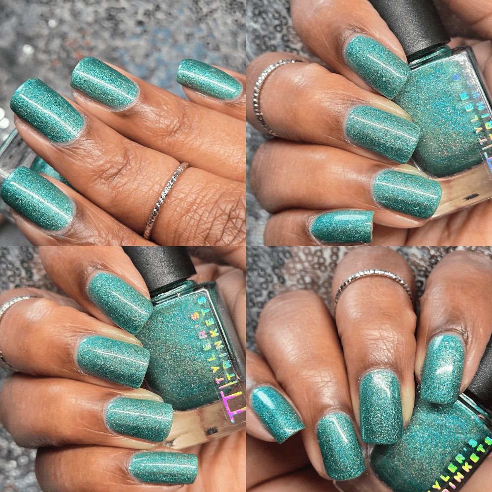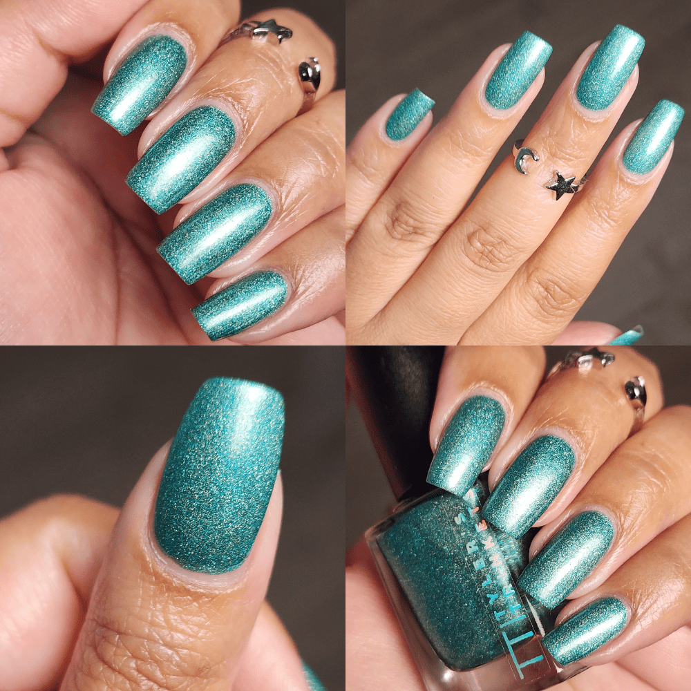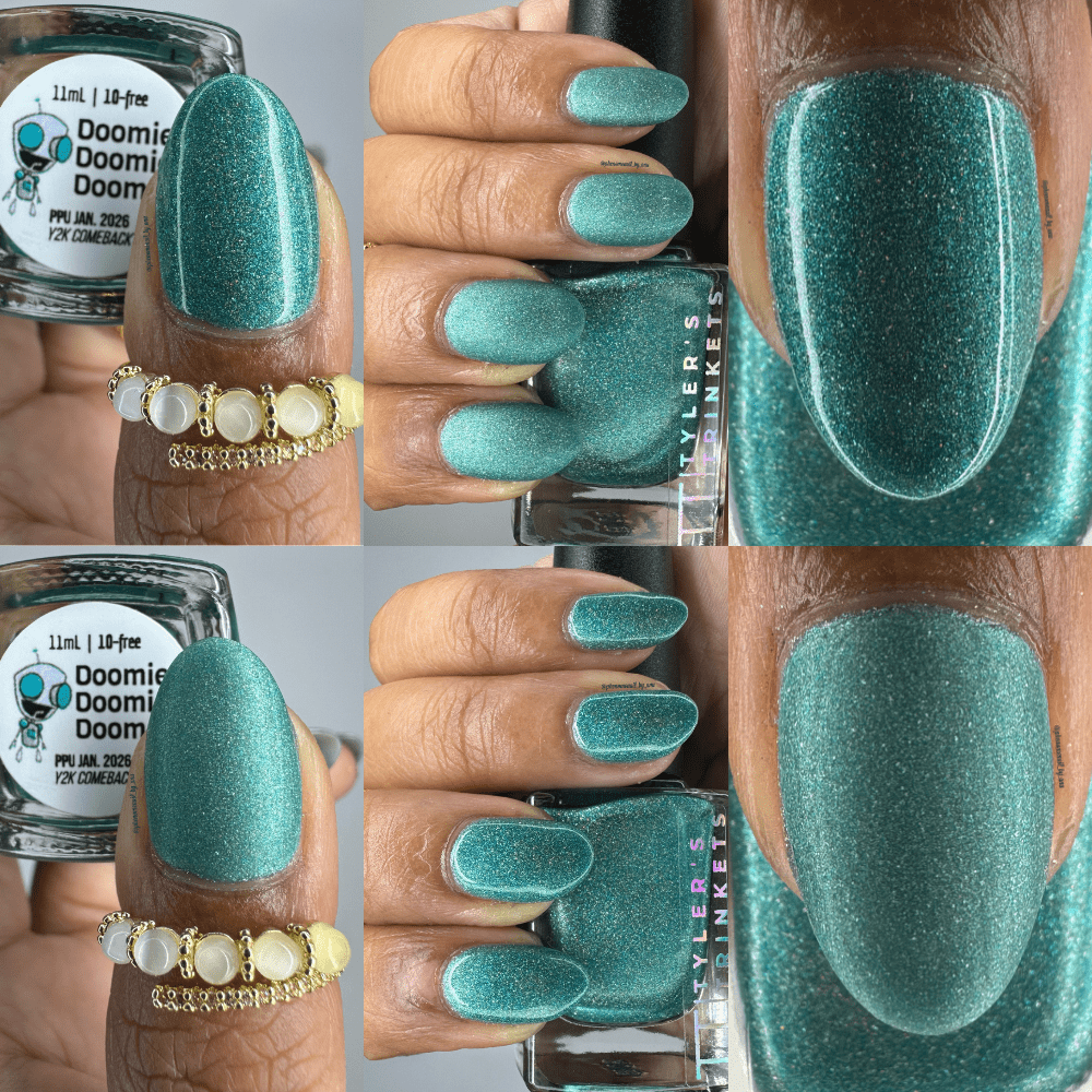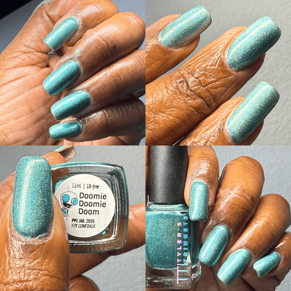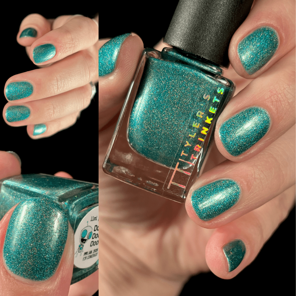 Inspired by the character Gir, from an iconic 2000s show: Invader Zim! Doomie Doomie Doom is a teal-blue base polish packed with fine linear holo pigment and scattered teal & silver holo glitters.